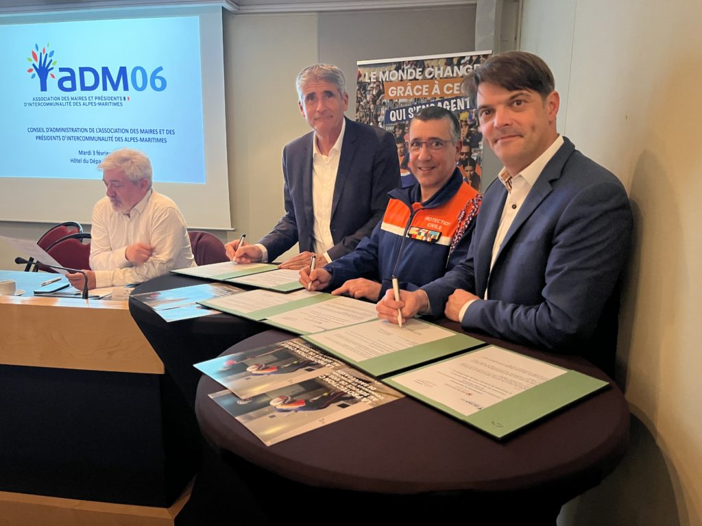 Le président départemental Eric CRISCUOLO a signé la convention de partenariat entre la Protection Civile des Alpes-Maritimes et l’Association des Maires et des Présidents d’intercommunalité des Alpes-Maritimes, représentée par son président Jérôme VIAUD (maire de Grasse), et l’Association des Maires Ruraux des Alpes-Maritimes représentée par son président Pierre CORPORANDY (maire de Puget-Théniers).